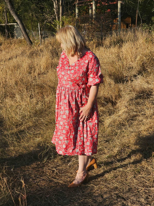 Versatile Cotton Wrap Dress with Pockets - Rose Red